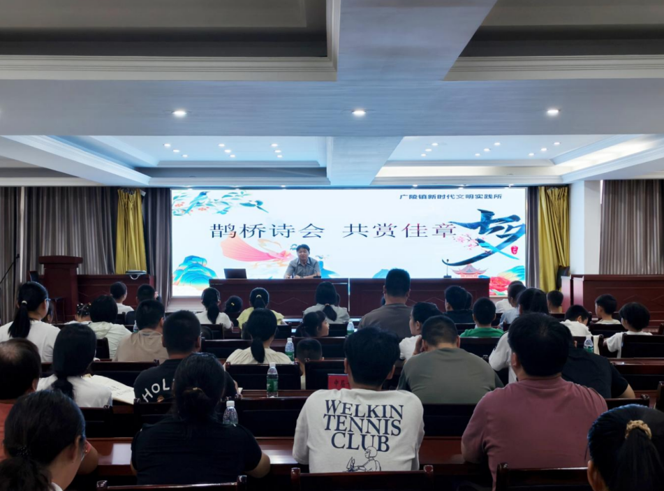 诗韵悠悠,唤醒文化记忆。诗词,是岁月长河中沉淀的璀璨明珠,串起了古今的情思。在广陵镇新时代文明实践所的道德讲堂里,“同心圆梦”志愿者赵涵涛带领大家一同探寻七夕诗词的绮丽世界。从秦观笔下“两情若是久长时,又岂在朝朝暮暮”的深情缱绻,到古诗十九首中“迢迢牵牛星,皎皎河汉女”的悠远空灵,在集体诵读的朗朗书声中,诗意如潺潺溪流,漫溢每个人的心田。