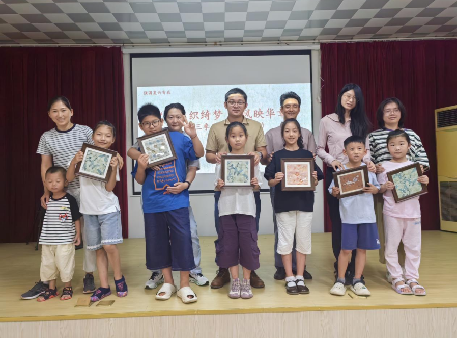 锦画传情,丝光珠影绘文化之美。“珠光流转,织锦星河”将传统丝绸工艺与现代美学相结合,孩子们在志愿者的指导下细细品味宋锦的华美,用珍珠元素对非遗文化进行重新演绎,点缀出一幅幅典雅精致的宋锦珍珠画。家长和孩子们在讲解中了解宋锦的历史,在协作创作中感受非遗的魅力。“没想到传统的宋锦也能这么‘潮’,做成的珍珠画既好看又有意义!”传统美学的魅力,让文化传承在亲子之间自然流淌。