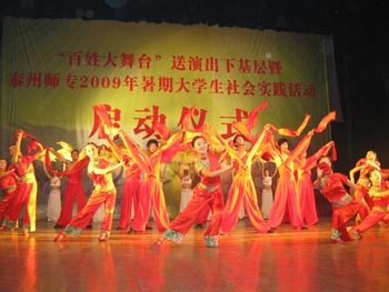 演出在群舞《欢聚一堂》中拉开帷幕,轻松欢快的旋律很快将近千名观众的情绪调动起来。 “家道它盼富裕,国运它盼昌盛,老百姓咱盼的是祥和万事兴……”一曲《咱老百姓》表达老百姓对党和生活的热爱与期盼。《如火的青春》以优美的舞蹈,深深吸引观众,将演出推向一个高潮。萨克斯独奏《像我这样的朋友》,二胡合奏《赛马》,男生四重唱《中国军魂》、《共青团之歌》等精彩节目轮番上演。演出现场高潮不断,掌声、喝彩声一浪高过一浪。 演出结束后,黄桥镇双桥村农民王根有说,以前只在城里看过这样的演出,现在“百姓大舞台”来到乡村为老百姓服务,想得真周到。他希望这样的演出多一些下乡。 今明两天,“百姓大舞台”将来到姜堰溱潼镇、兴化临城镇,送去文化“盛宴”。 |