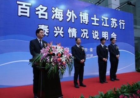 14日,江苏省泰兴市又一次迎来了“百名海外博士江苏行”活动的海外博士们。中共泰兴市委、市政府对远道而来的海外博士们表示热烈欢迎和诚挚的感谢。江苏省人力资源和社会保障厅副厅长陈励阳,中共泰兴市委书记、市人大常委会主任张兆江,中共泰兴市委副书记、市长高亚梓等领导出席了此次泰兴说明会和项目洽谈会。