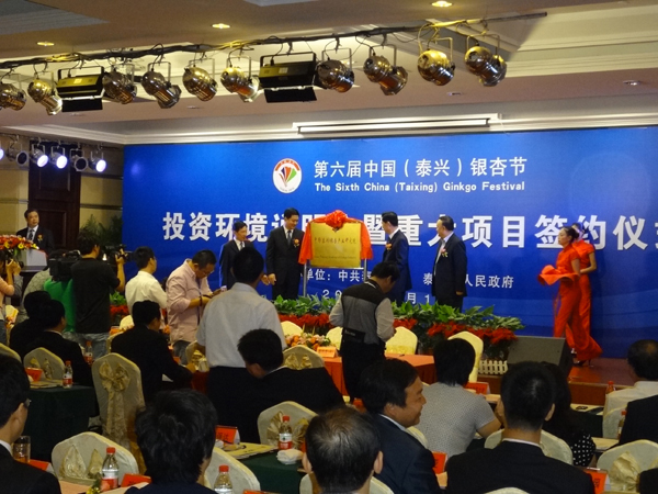 16日上午,举行了投资环境说明暨重大项目签约仪式,同时还为银杏产业研究院、南工大技术转移中心泰兴分中心揭了牌。签约仪式上,签约的35个项目总投资169亿元,协议利用外资1.88亿美元。其中亿元以上项目20个,10亿元以上项目6个,最大项目的投资规模达45亿元,单体平均投资规模达4.8亿元。35个项目中,工业项目21个、农业项目6个、服务业项目7个,科技合作项目1个,新兴产业项目8个。