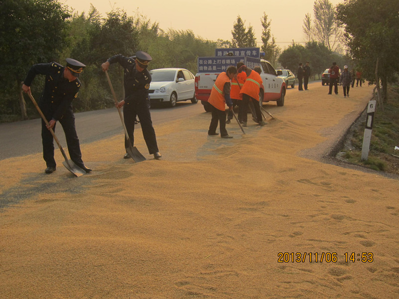 为全面彻底整治晒粮现象, 11月6日,泰兴公路站联合泰兴交运局、曲霞交管所、蒋华工区,对所管辖的珊七线路段大面积占道晒粮现象进行了一次专项整治,并邀请泰兴电视台进行了跟踪报道。此次专项整治的目的一是维护路容路貌,二是促进道路的交通安全,三是提高群众的法制意识。对此,路政执法人员现场说法,并帮助群众清收稻谷,共计清除大面积占道晒粮7处,受到了过往行人车辆的一致好评。