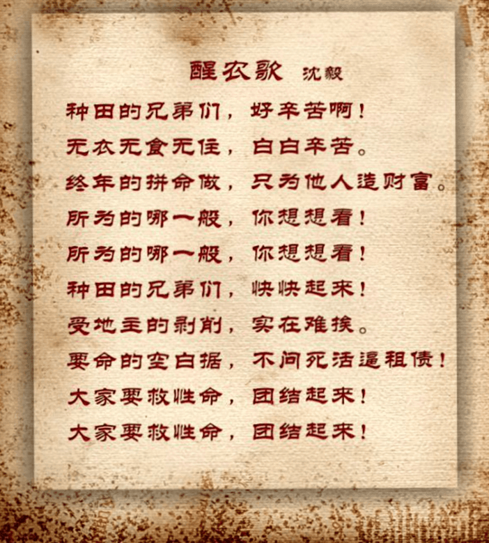 1926年6月,沈毅主持召开刁家网农民协会成立大会,1000多名会员参加,刁九善当选为会长。这是扬州、泰州地区第一个农民协会。在成立大会上,沈毅把刁家网村更名为“醒农村”,并为此创作了《醒农歌》:种田的弟兄们,好痛苦啊!无衣无食无住,白白辛苦,终年的拼命做,只为他人造财富。所为的那一般,你想想看!所为的那一般,你想想看!种田的弟兄们,快快起来!受地主的制削,实在难挨,要命的空白据,不问死活追租债。大家要救性命,团结起来!大家要救性命,团结起来!这首歌到处传唱,对唤起广大农民团结起来反对封建统治,起到了积极的鼓动作用。