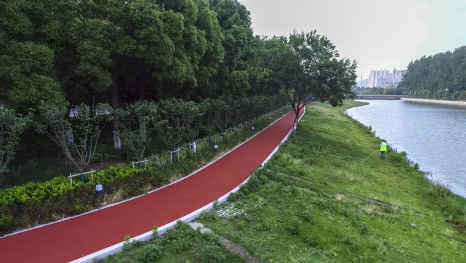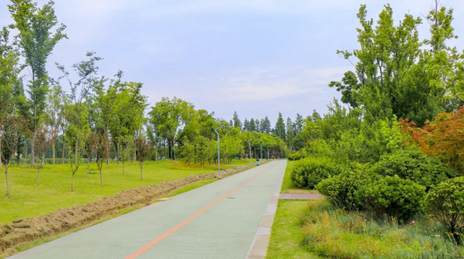 羌溪河城市公园慢行步道: 位于泰兴市羌溪河西侧、南接澄江路、北靠文昌路,占地面积约13.5万平米。园内有一条环绕全园、长达2.5公里的慢行步道,步道宽3.9米,采用了彩色透水混凝土,步道沿线精心搭配了各类绿化品种,营造曲径清幽、四季芳华的漫步体验。