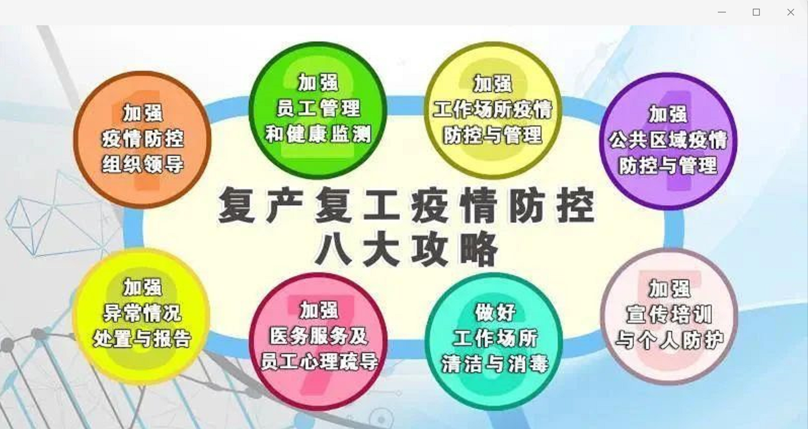 企业复工复产疫情防控重点:员工健康监测和管理、工作场所通风清洁消毒、科普宣教与个人防护、出现异常状况应急处置等。 外来人员较多的企业疫情防控重点:流动员工健康管理、宣传教育、员工就餐、集体宿舍等防控措施。 流水线作业等人员密集作业场所的企业疫情防控重点:作业场所人员登记、工作场所通风以及场所清洁消毒和个人防护等。
