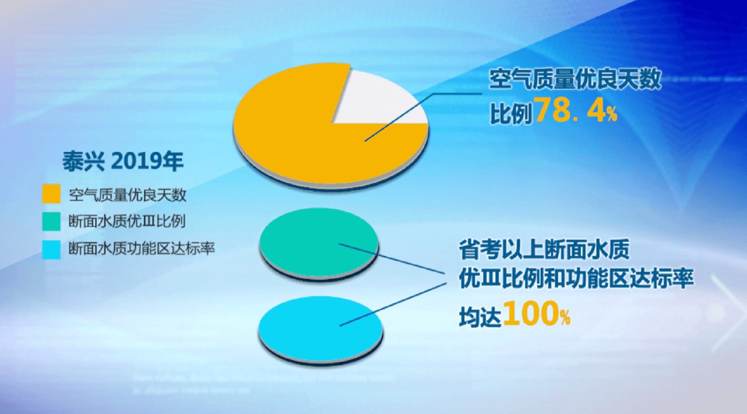 2019年,全市空气质量优良天数比例78.4%,较2018上升2.5%;PM2.5浓度为每立方米39微克,较2018年下降17.0%。省考以上断面水质达标率和优Ⅲ比例均达100%。
