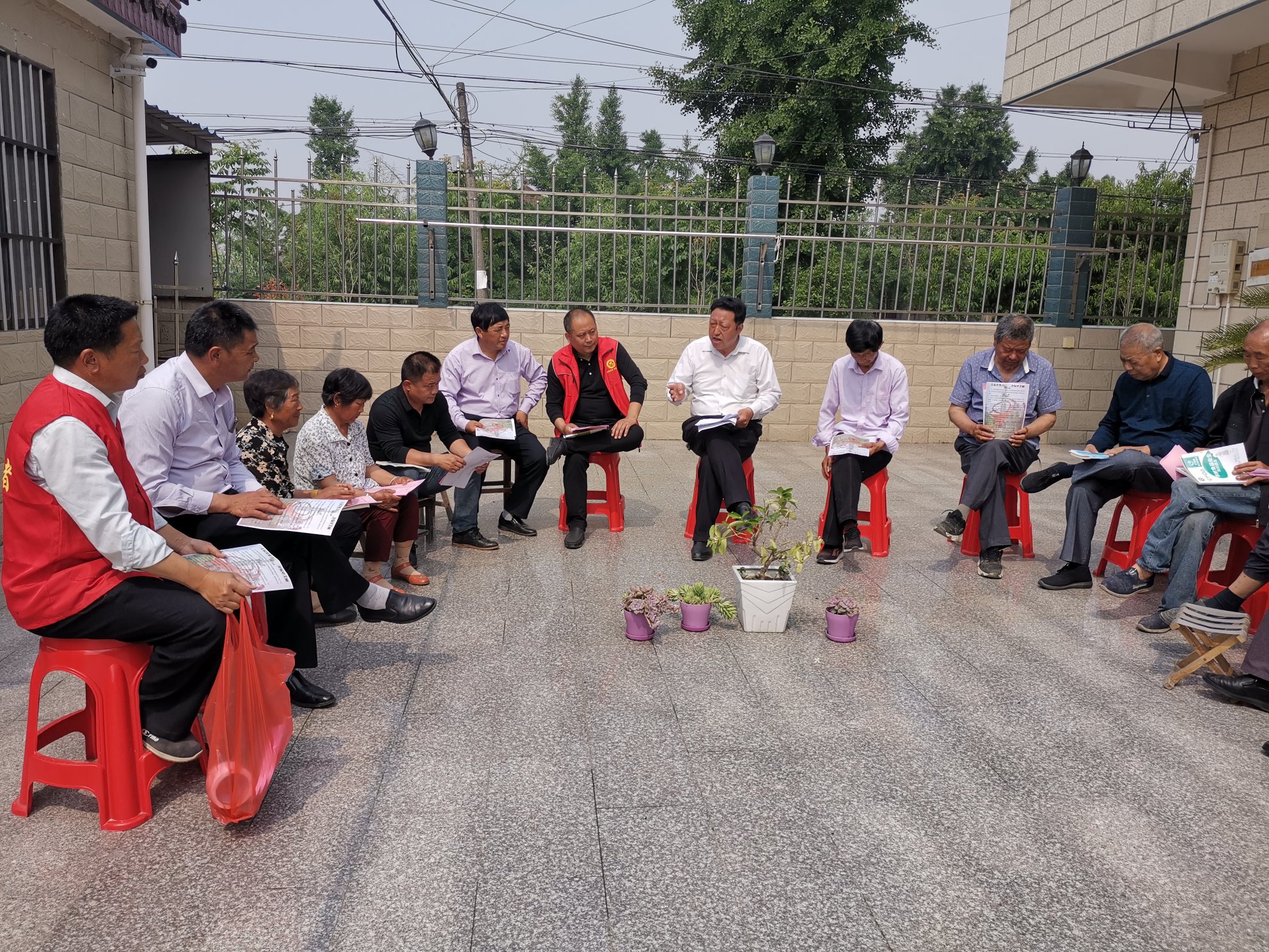 随后,他们走进新挂牌的美丽庭院,拿起小板凳围着绿植盆栽坐了下来。周玉春书记举起手中的书回忆道:“当初,我坚持开展板凳读书会活动,就是为了提高全体村民群众的素质。通过坚持不懈的学习,大家解放了思想,开拓了视野,头脑中树立了将我们开绿村打造成远近闻名的美丽乡村的意识,借鉴了书中的先进经验,才有了我们的《开绿村美丽公约》。”