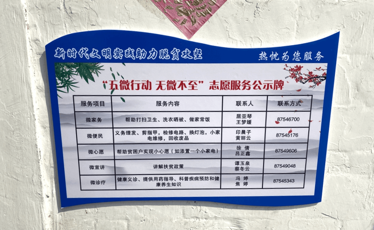 微家务:“小时工”在线接单 脱贫攻坚不止要扶贫,也要“抚”心。“多谢党和政府对我们这些老人的关心,平时都是一个人,今天心里真是说不出的感动。”叶文英平时一个人在家,缺少交流对象,志愿者为老人烧饭打扫,一起吃饭,让温暖与爱凝聚,把弘扬孝老敬老融入到脱贫攻坚。姚王镇党委关注贫困户的精神需求,聚焦孤寡老人的生活层面,以“微家务”的形式为特殊人群做一顿家常饭、话一次家常、打扫一次卫生、洗一次碗筷,以真心的陪伴送去温暖与关爱。 微便民:“管家”面面俱到 在常态化的贫困户走访活动中,姚王镇党委发觉有的建档立卡户出门不易,给日常生活造成了不便。对此,“五微行动”建立健全便民服务体系,以姚王镇团委的青年志愿服务队为主,建立起相对应的资源库。将志愿服务队负责人的名单公示,张贴至全村所有建档立卡低收入户入户醒目处,由村(居)新时代文明实践站统一派单,各志愿服务队随时接单,常态化开展贴近群众生活需要的志愿服务。