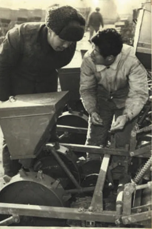 1979年,兵团石河子垦区引进地膜覆盖技术,在7.5亩地上试验种植棉花,结果增产35%,但人工铺膜一天只能铺4分地。铺膜后,要靠人工在地膜上点种,进度慢、劳动强度大……