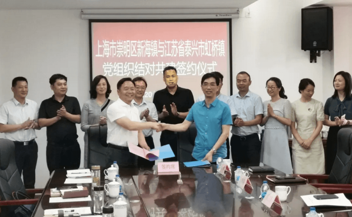 6月19日,江苏省泰兴市虹桥镇党委与上海市崇明区新海镇党委签署党组织结对共建协议书,标志着这对跨省党建联盟正式启动。 新海镇位于崇明岛北沿,虹桥镇地处长江北岸,蓝天、碧水、净土,生态优先、绿色发展,是两地共同的发展诉求。