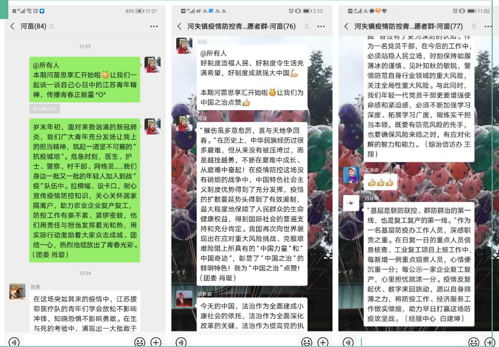 依托“河苗驿站”阵地,积极打造“河苗思享汇”交流服务平台,线上线下“双线”发力,建立起青年互相碰撞思想火花的平台,用青春力量破解部分基层治理中的难点。线上集中学习交流,建立“河苗”微信群,围绕“聚精-思享·信仰”“聚论-思享·术业”“聚议-思享·漫谈”三大板块,每期讨论交流不同主题内容,推动党的创新理论及新思想入耳入心;成立“河苗青年说”线上宣讲队,积极探索创新理论宣讲模式,通过凝聚青年力量,向村民及时传递党的声音,传递正能量。线下志愿服务行动,发挥全镇青年党团员先锋模范作用,组织“河苗青年志愿者服务队”多渠道多形式开展各类主题宣传、志愿服务,鼓励、引导新兴青年加入,切实把“机关+村+企业”青年的智慧和力量凝聚到服务本镇发展上,打响基层治理志愿服务品牌。