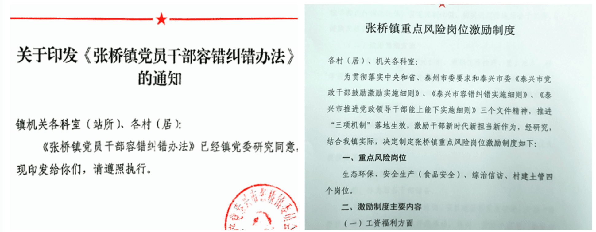 “加”关怀,让干部敢为 及时疏导减压,完善干部谈心谈话制度,如果发生岗位调整、工作生活遭遇重大挫折、发现苗头问题、受到诬告错告等情况,及时倾听干部诉求,为干部解疑释惑、疏导压力、加油鼓劲。优先容错减压,出台《张桥镇党员干部容错纠错办法》。台风刮倒围挡,影响群众出行安全,汤庄村党总支书记何小军在未通过公共资源交易情况下,实施了抢修工程,镇纪委对其容错纠错。重点保护减压,对确属遭受诬告错告、恶意中伤、打击报复等情况的干部,通过适当方式为其澄清和正名,及时消除负面影响,同时做好思想转化,使其放下“多做多错”思想包袱,打消顾虑、轻装上阵,焕发工作激情。