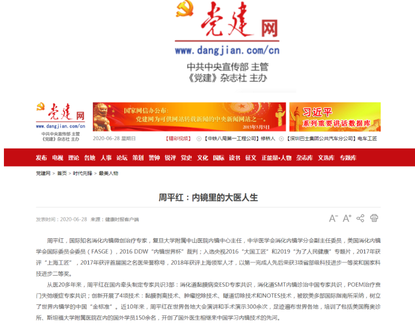 “周”式手术 2012年春节前夕,一位98岁高龄的老先生在子女的陪伴下来到中山医院内镜中心,他们是慕名前来找周平红的。 周平红运用内镜进行一番探查后,终于找到了老先生多年进食后呕吐的原因:贲门失弛缓征,贲门环状肌出现痉挛,食物容易被痉挛收紧的贲门环状肌堵在食管里,无法进入胃部。 POEM手术可根治贲门失弛缓征,还实现了“无切口、微创伤”的突破。这是周平红的“绝活”,一般耗时只需30分钟,创面不见一滴血,患者第二天可以照常饮食,第三天就出院回家了。 如今,中山医院内镜中心成为全国各地贲门失弛缓征患者的汇聚之地,远至俄罗斯的患者也前来就诊。患者年龄最大的103岁,最小的只有11个月。全世界5000例POEM手术,周平红团队做了一半! 其实,POEM的手术方法来源于另一项内镜手术——内镜黏膜下剥离术(ESD),这项国际尖端技术也是由周平红首先引进并在国内推广的。 不甘平庸 周平红回顾自己成长的过程,总结出两点:一是脑子不笨;二是不甘平庸,敢尝试。 他是在泰兴农村长大的。中学读了7年,中考考数学时,借了亲戚一块手表,当时没见过手表,考试中一调,就把时间调错了。再重新读,就考全年级第一了。1986年高考,泰兴东半县第二名。 1992年大学毕业分到中山医院普外科,那时不是天天开刀,有时上午开刀,下午就睡觉。“浪费”了两年,想,这样下去不对了,就要求去内镜科做内镜,多掌握一门技术。 2006年,他再赴日本学习消化道早癌微创切除新技术,回来不顾反对就开始尝试;那时日本的奥林巴斯器械国内还没有,他就自制,找工人用老虎钳把针刀的刀头弯成镰刀状。 他还创造性地开展了一系列微创治疗新方法,其中包括在国内率先开展的胃肠道早癌和癌前病变序贯筛查,以及内镜黏膜下剥离术治疗。 前几年,他到德国去做手术,一个18岁小姑娘被发现胃部有一肿块。他原本想为她做内镜下全层切除,但术中德国医生连连说“stop”,担心穿孔,不让他做。无奈,只能配合德国外科医生行剖腹手术,把小姑娘的胃切掉三分之二。 切下来后,他将标本剖开看,发现“瘤”长得很深,认为是“异位胰腺”,并列举了5个理由。但站在身后的几国医生都不相信,坚持认为是间质瘤。 回国路上,他垂头丧气——“一个内镜手术变成了外科手术”!但几天后就收到了大会主席的邮件——“祝贺您!周教授,您是全世界为数不多能够诊断异位胰腺的人。”周平红回复:“不,中山医院内镜中心的任何医生都能诊断。”他还是有点遗憾,小姑娘的胃切掉三分之二,容易营养不良。