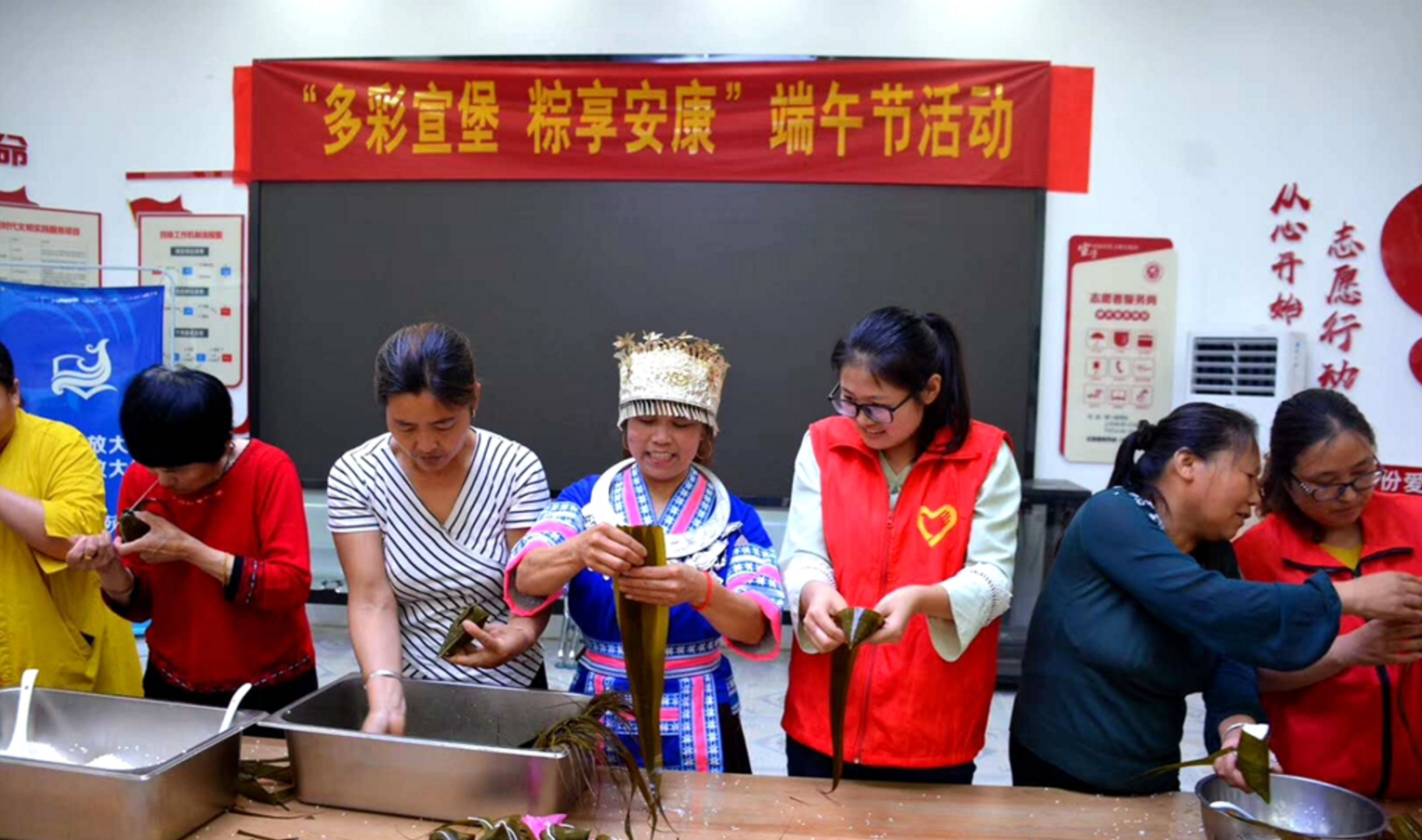 在宣堡镇新时代文明实践所,《七律·端午》《端午思》《他乡的端午》《浣溪沙·端午》……一首首经典诗歌,让大家感受到了端午节的文化内涵,体会到了传统节日的独特魅力。现场40多名志愿者和部分少数民族妇女共同包粽子,一起体验民俗、享受快乐。