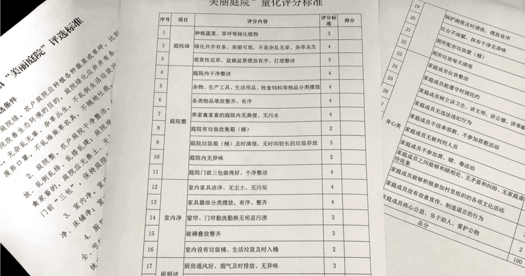 一份测评表 本着“量化、客观、公正”的原则,“美丽庭院”以农户为单位,将“美丽庭院”创建分为五项量化要素:庭院绿、庭院整、室内净、厨厕洁、身心美,实行计分评比。最终根据积分高低确定名单,并对“美丽庭院”的农户进行挂牌及物质奖励。明确、细化评选要素,不仅便于评选公正,更加利于农户对照标准进行整改,丰富庭院、美丽生活。