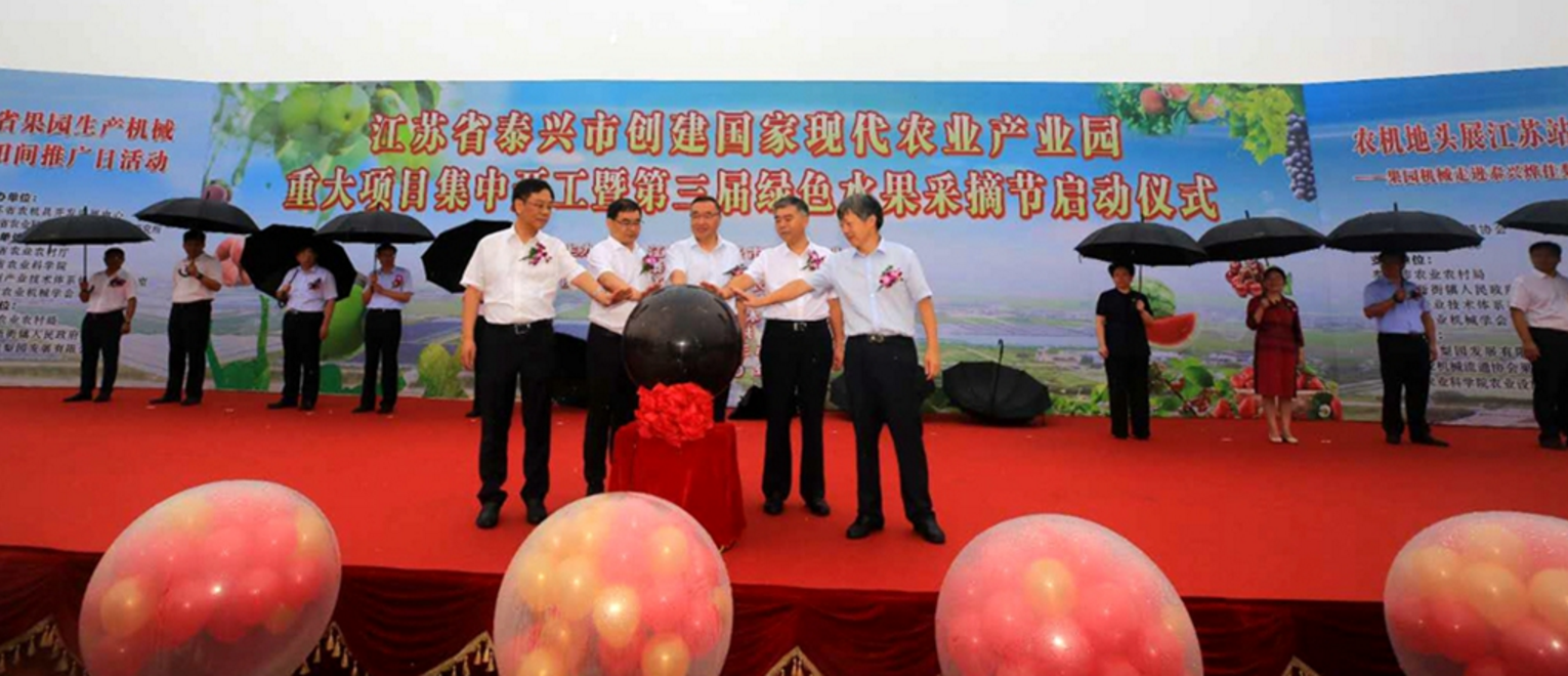 7月5日,江苏省泰兴市举行“创建国家现代农业产业园重大项目集中签约开工暨第三届绿色水果采摘节”启动仪式,喜迎“省果园生产机械田间推广日和国家农机田头展江苏站——果园机械走进泰兴烨佳梨园”活动开幕。