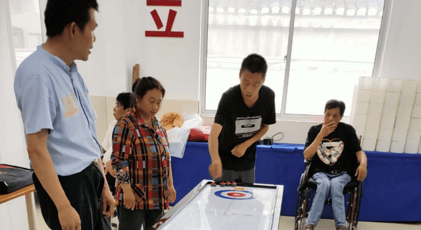 “为了精准发力,促进残疾人全面脱贫、全面小康,我们根据每个残疾人家庭及残疾人个人的特点和实际需求,因人施策、一户一策、一人一策,提供个性化、差别化的帮扶和关爱举措。”曲霞镇党委副书记周渊伟介绍,近两年,先后为16名高寿残疾老人祝寿,对22户残疾人贫困家庭实施了居住环境无障碍改造,为30名残疾人白内障患者进行了免费手术,向320名残疾人发放了轮椅、助听器等400多件辅具,为建档立卡残疾人发放彩电20台、洗衣机14台、电风扇35台、电饭煲28个,为16户残疾人家庭安装了太阳能热水器,向5名残疾学生和13名建档立卡的残疾人子女发放了教育补贴。截至目前,全镇117户建档立卡低收入残疾人家庭已全面实现脱贫。 建家园,让残疾人小康有“底气” “手上的力道再强一点、方向再稳一点,对,就这样,再练习练习。”在曲霞镇“残疾人之家”,康复治疗师尹静指导残疾人进行桌上冰壶球训练。为了给残疾人一个温暖的家,曲霞镇依托本地企业和托养中心,整合多方资源,建成了以辅助性就业为主,集日间照料、康复训练、文体活动等多种服务于一体的“残疾人之家”。