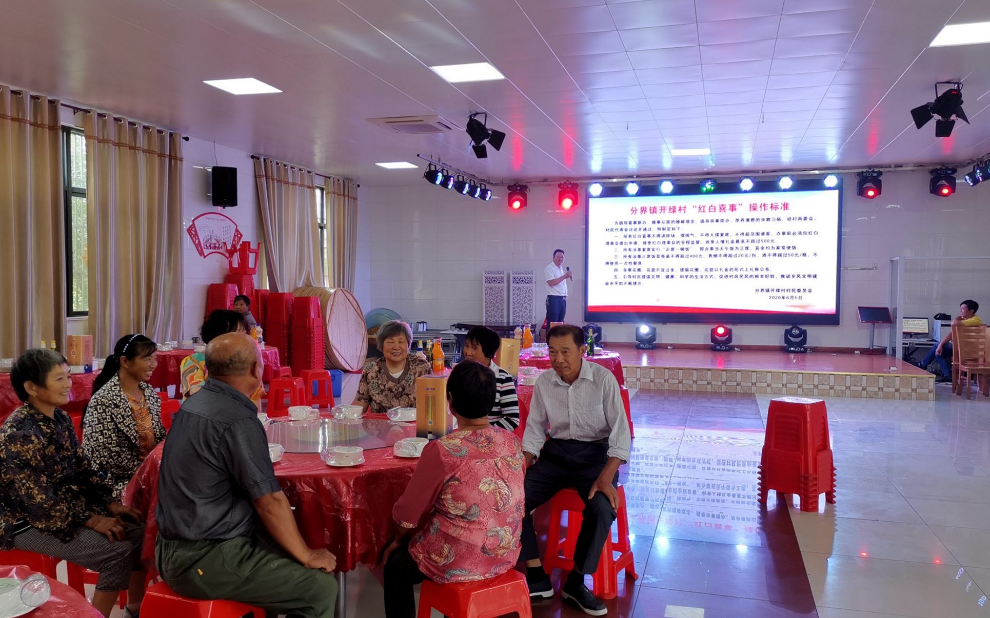 树立一种好风气——全员参与移风易俗 “婚丧嫁娶反浪费,请找红白理事会,六个盘来六个碗,可口饭菜不要剩。”在开绿村百姓大舞台上,村文艺队将村规民约编成《移风易俗七字歌》演出传唱,妇孺老幼耳熟能详。开绿村开辟宣传栏、文化墙,大力宣传社会主义核心价值观和移风易俗相关内容,使党员干部和群众在潜移默化中加深理解,入脑入心。“全镇还利用新时代文明实践所站、道德讲堂等平台,传播文明祭祀、建设节约型社会新风尚;开展‘好邻居’’好婆媳‘‘美德善行榜’等推荐评选活动,树立乡风文明典型,为乡村振兴凝聚正能量。”分界镇党委书记樊晖表示。
