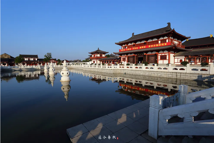穿越千年,原位于县城内庆延铺的这座古寺,建于北宋真宗咸平二年(999年),元朝驸马都尉蔡梦祥舍宅增广,一时成为“江淮之名蓝”。明万历中,县令陈继畴重修寺院,再现辉煌,笔下生花,作诗“庆云清梵”,遂成泰兴一景。迨至光绪年间,古寺已名闻大江南北,僧众数百人,占地百亩,殿宇百十余间,黄墙黛瓦,飞檐翘角,古木森森,碧水环抱。此后,战火纷飞,社会动荡,寺院屡遭创伤,几成废墟。改革开放的春风催生了宗教文化的复苏,古寺移址重建,山门殿上,全国政协副主席赵朴初手书“庆云禅寺”额赫然醒目。