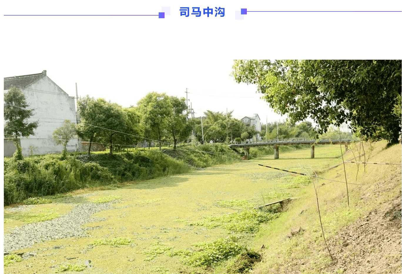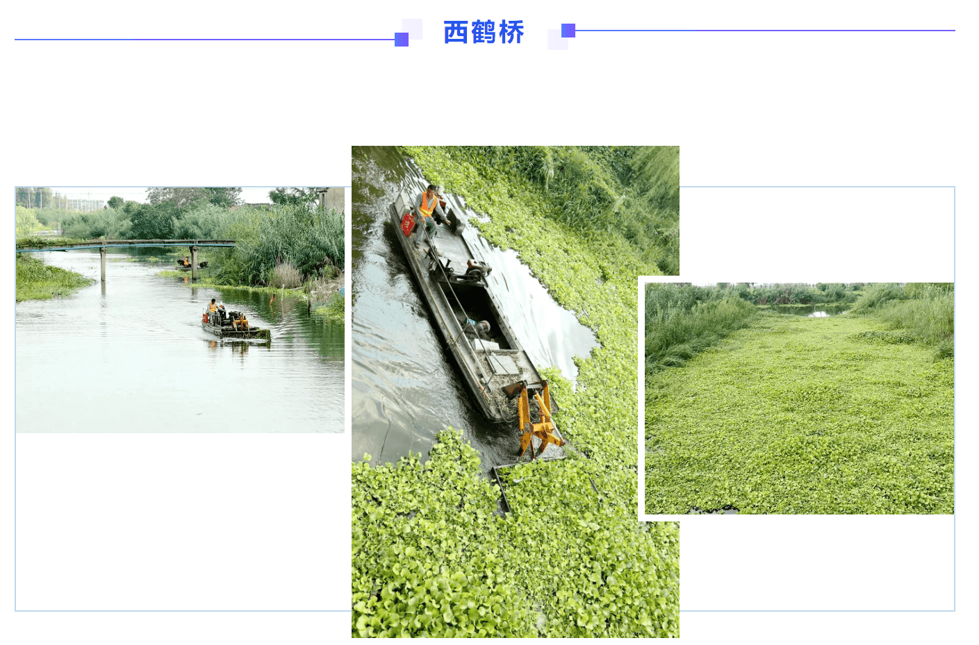 河失镇司马中沟爆发性增长的水生植物,几乎覆盖了整条河道,机械化保洁船不断放下抄网进行清理,船后是一百多米已经清理干净的河面。