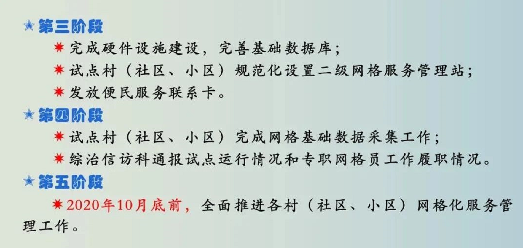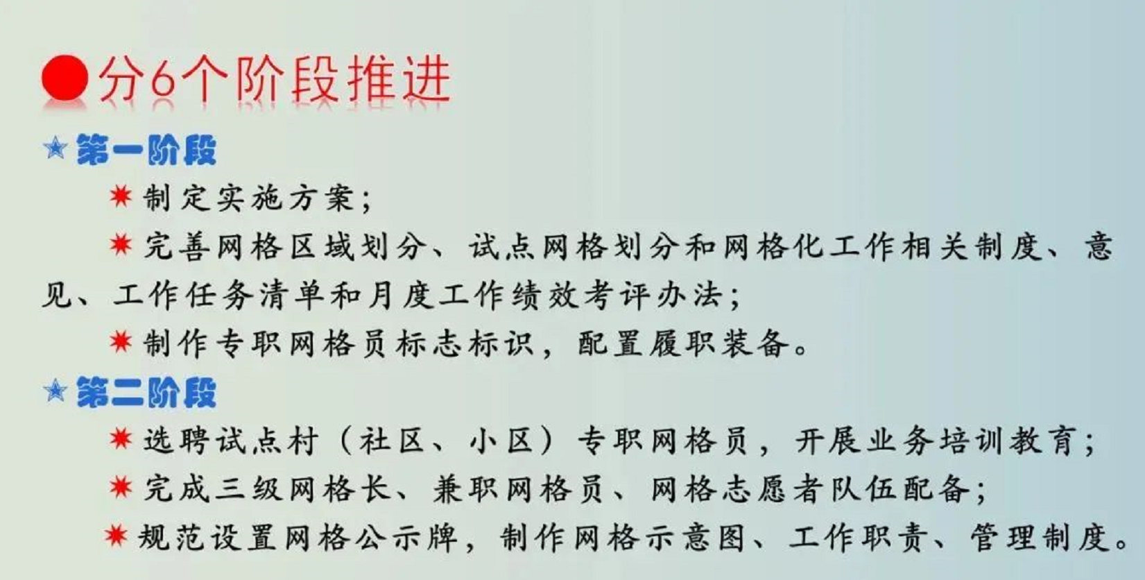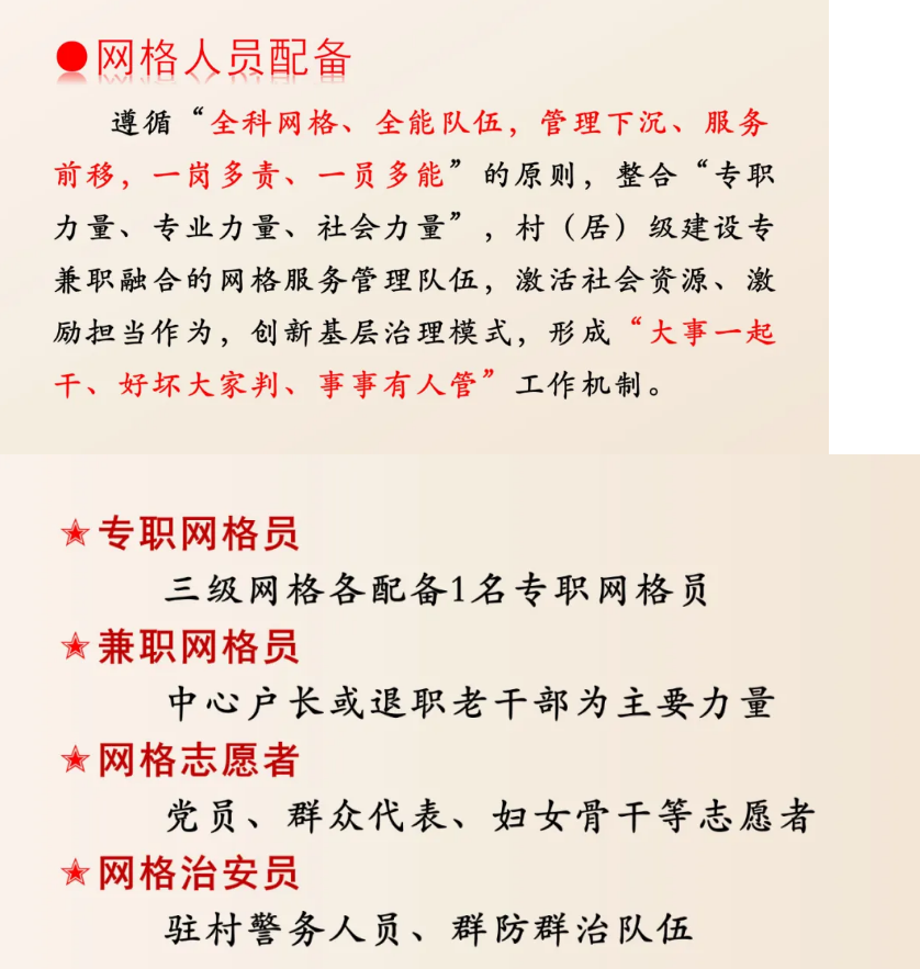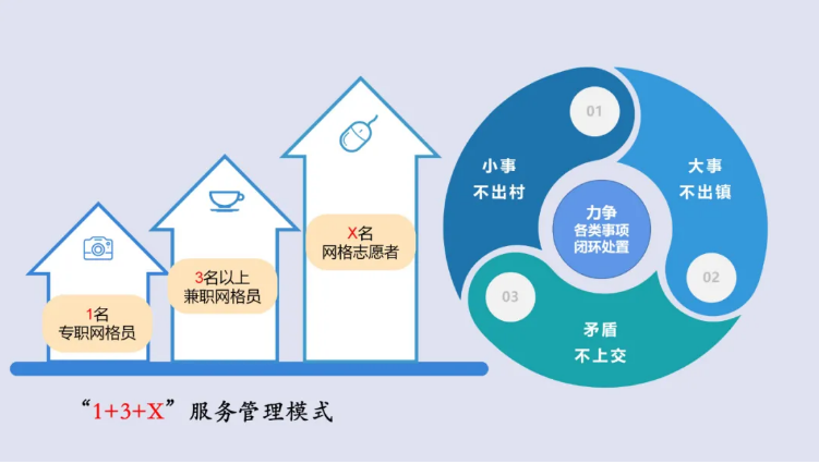 加强专兼职网格员队伍建设,构建“1+3+X”服务管理模式(1名专职网格员、3名以上兼职网格员、X名网格志愿者);健全网格化责任落实机制,制定网格管理责任清单,推行定位管理、节点管理,强化绩效管理,不断提高网格化运行机制的规范化水平。力争各类事件在村(社区、小区)级网格实现闭环处置,进而实现“小事不出村、大事不出镇、矛盾不上交”。