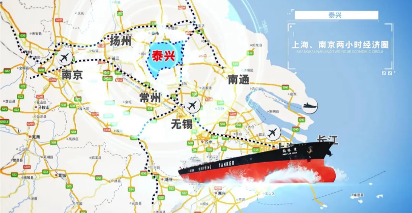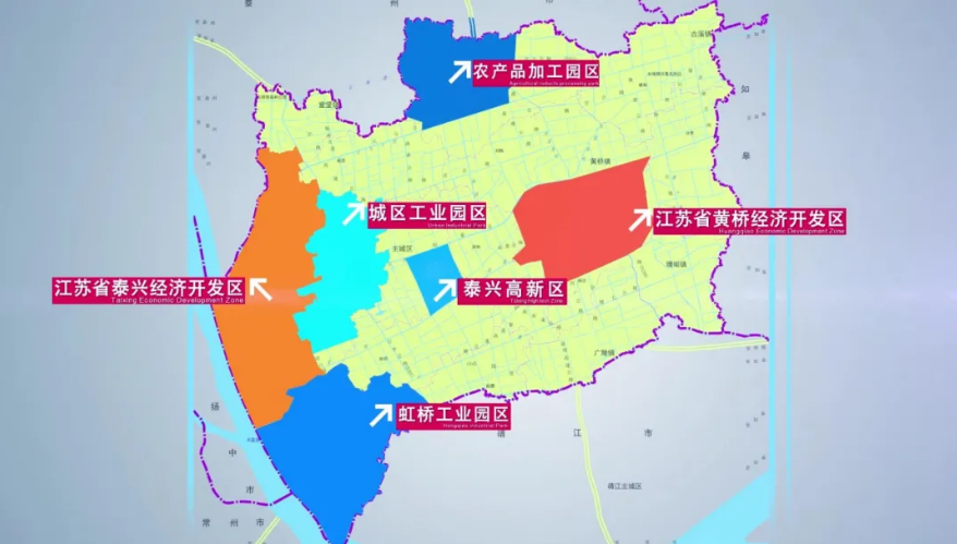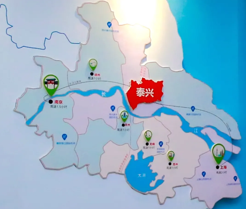 泰兴因江而生、依江而兴,拥有1172平方公里地域,下辖16个乡镇(街道)、3个省级开发区、3个市级园区。万里长江向东奔流,流入泰兴昂首向南,然后拐弯向东、直奔大海,24.2公里的长江岸线将泰兴镶嵌其中,呈现出一个“聚宝盆”似的“弧形洼地”。