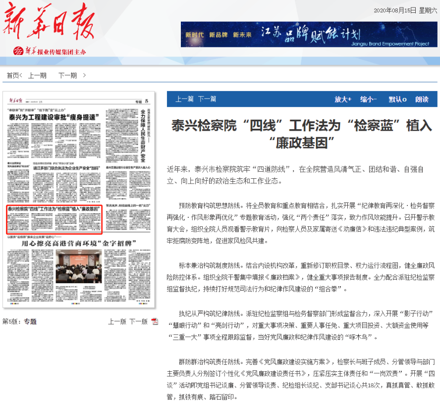 《新华日报》报道泰兴市检察院“四线”工作法,如何为“检察蓝”植入“廉政基因”?