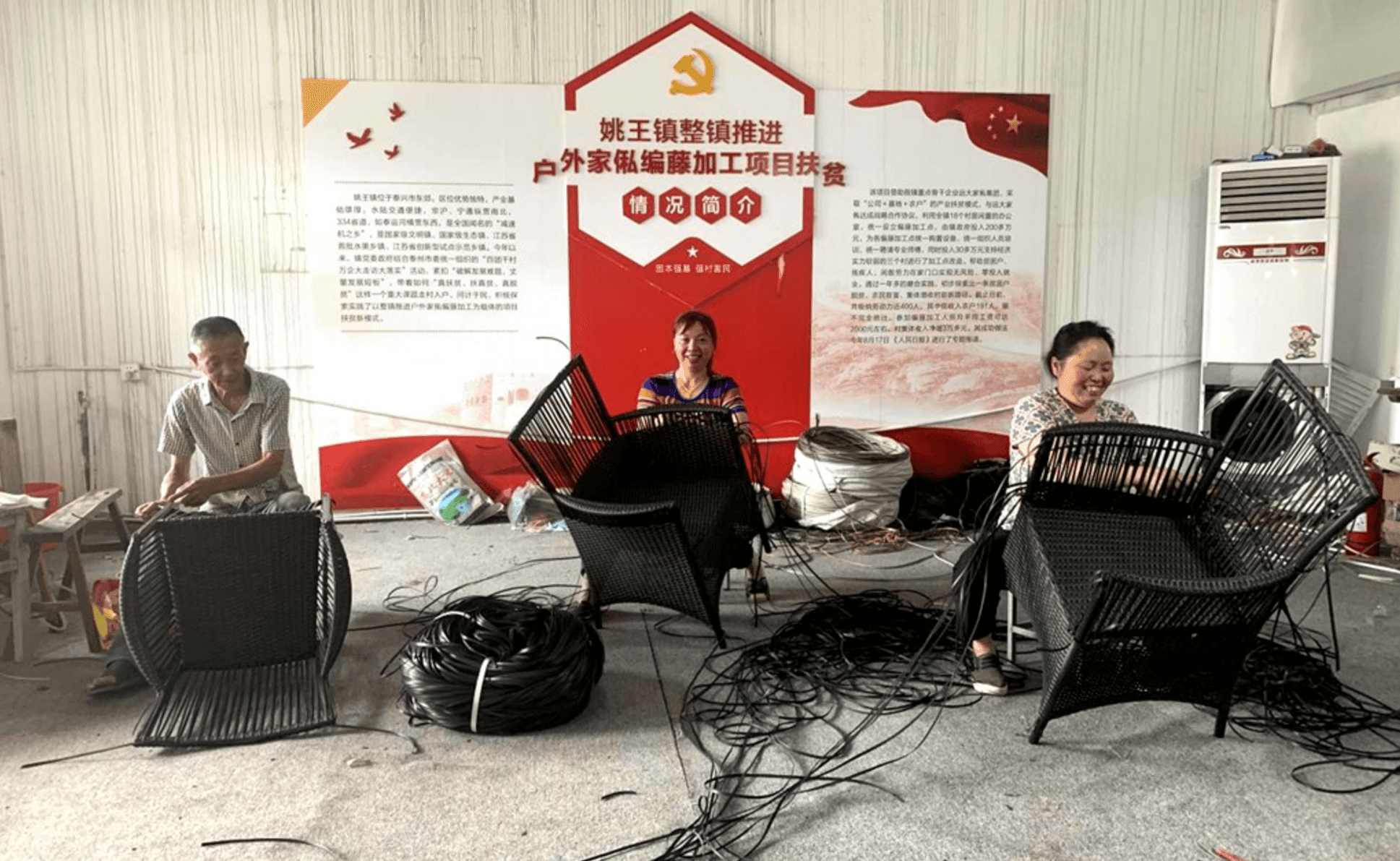 全力甩掉穷帽子 近年来,大量村民从繁重的农活中解放出来,青壮劳力基本上在外或者在本地企业就业,剩下一群年龄大、身体不好的村民。为了解决他们的就业难题,周宏多方调研,寻找适合的项目。2015年,在镇党委政府的大力扶持下,自筹资金20多万元,盖起了500多平米的创业富民点和残疾人辅助性就业点,引进了户外编藤加工和轻纺产品包装项目。村干部带头参加培训,再教会其他人。全村近50名闲散劳动力,包括有一定劳动能力的残疾人,均在加工点找到适合自己的工作岗位,月均收入千元以上。