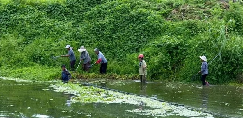 蔡亚飞、张仁贤的作业小船上没有遮阳设备,他们戴着一顶草帽,小船在河面上缓缓前行,看到水面上漂浮着的水生植物,就停下来用网打捞。汗水不断地从毛孔里渗出,他们早已汗流浃背。