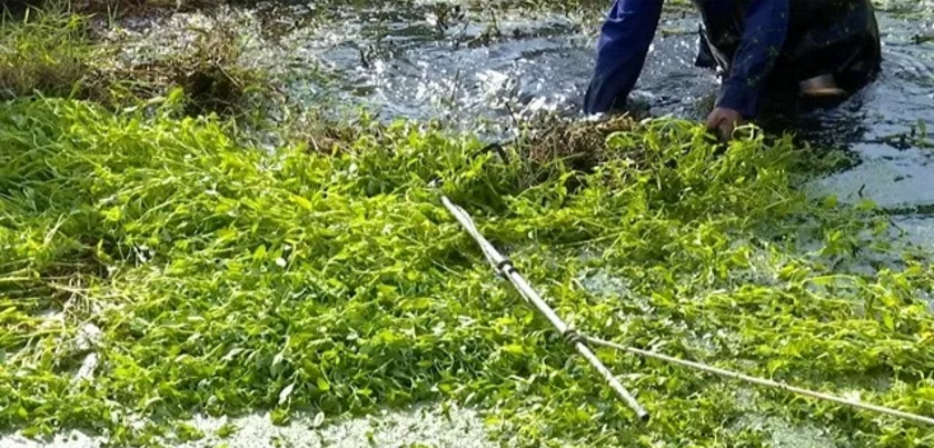 “这两天河里的水葫芦长得特别快,我们俩每天打捞的任务很重,为了避开高温,我们早上天刚亮就出来了。”昨天上午8点半,记者在河失镇跃进中沟采访中,打捞员蔡亚飞、张仁贤告诉记者,他们已经工作近3个小时了。