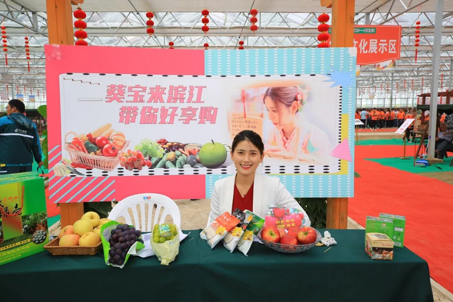 车厘子、红心猕猴桃、翠冠梨、有机大米、色拉油,还有蒲地蓝……滨江特产摆满了直播桌。