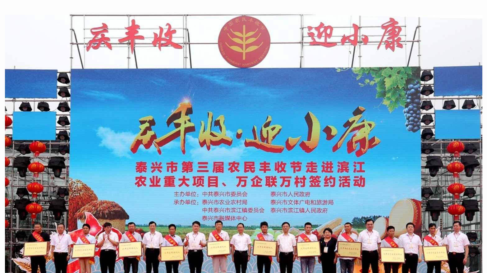 农民丰收节,既是农民庆丰收、晒丰收的日子,也是全社会享丰收、助增收的节日。在泰兴市第三届农民丰收节上,“万企联万村,村企共建”签约引人关注。泰兴市苏中制粉有限公司与黄桥镇合心村、泰兴市尚行机械设备制造有限公司与分界镇周南村、泰兴市襟江投资有限公司与滨江镇新星村、泰兴苏中万汇龙家居装饰城有限公司与济川街道三六村签订共建协议。今年以来,按照省、泰州市“万企联万村 共走振兴路”行动部署要求,泰兴市研究制定实施方案,全面梳理村企需求,组织筛选对接,确定306个涉农村居参加村企联建行动。截至目前,全市村企意向联建率达100%,270个村与企业达成100万元以上联建项目,100万元以上项目村签约率达72.55%。