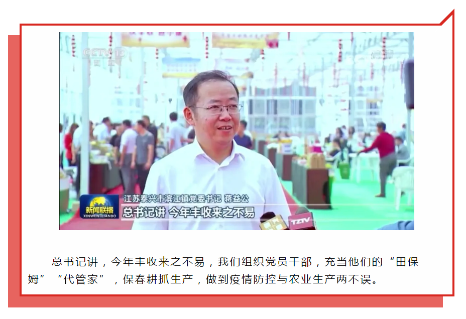 泰兴市滨江镇党委书记蒋益公在智能玻璃大棚里接受采访,他这样告诉全国人民: “总书记讲,今年丰收来之不易,我们组织党员干部,充当他们的“田保姆”“代管家”,保春耕抓生产,做到疫情防控与农业生产两不误。”