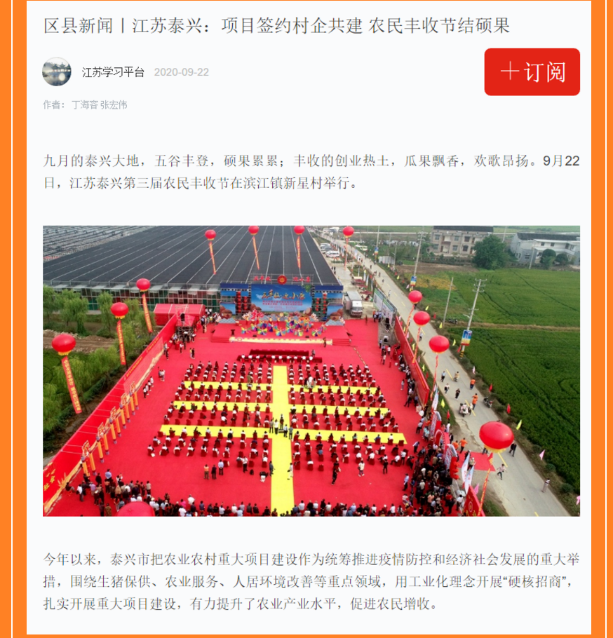 9月22日《新闻联播》聚焦泰兴第三届农民丰收节,泰兴用大数据物联网智控等技术,为农田管护保驾护航。