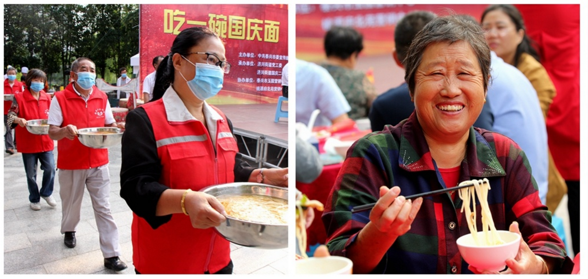 国庆吃面,国泰民安!近日,泰兴市委宣传部、文明办主办,济川街道、国庆二村社区承办了“吃一碗‘国庆面’,共祝祖国好”活动。