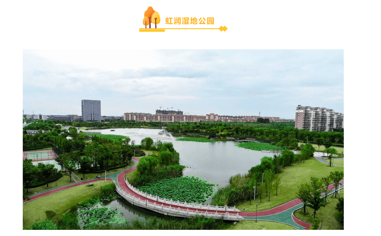 虹润湿地公园建设了人工湖、亲水平台、生态水岸以及运动休闲等设施,形成水景观赏区、亲水区、文化娱乐休闲区、游乐健身区和运动区等五大功能板块。