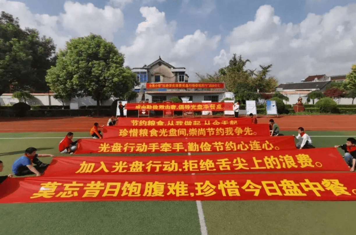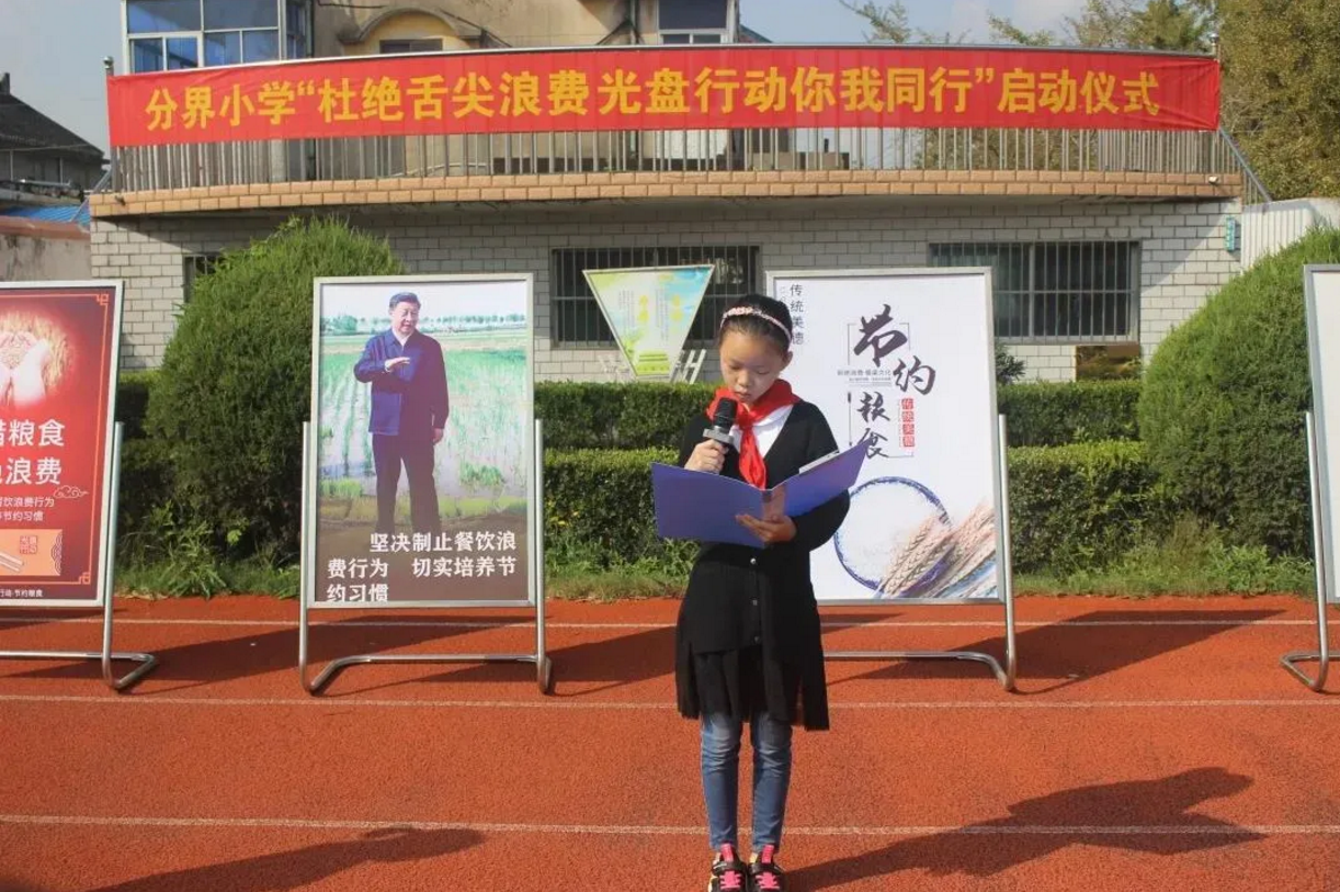 分界小学 为了进一步弘扬中华民族传统美德,提高学生们珍惜粮食、勤俭节约的意识,分界小学举行了“拒绝舌尖浪费 光盘行动你我同行”主题活动启动仪式。
