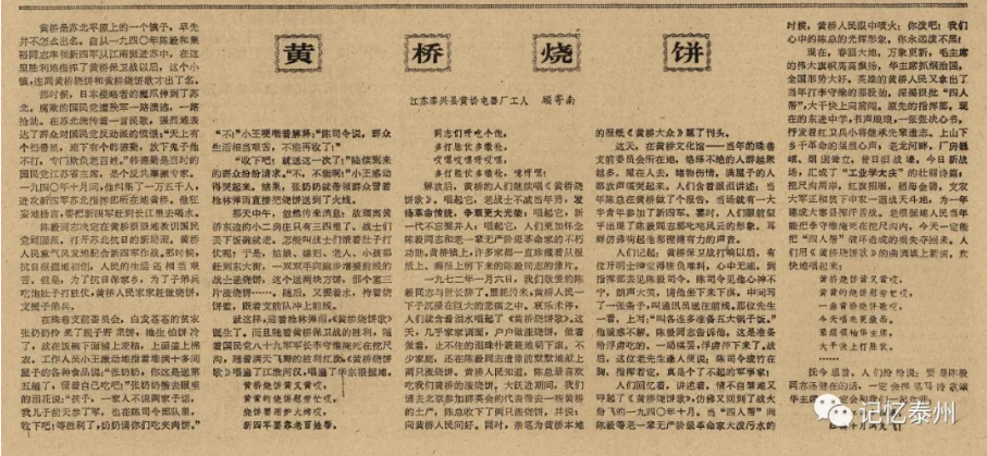 从上世纪四十年代的一首《黄桥烧饼歌》、七十年代全国中学语文课本中一篇《黄桥烧饼》散文、八十年代在全国各地放映的一部《黄桥决战》电影,再到本世纪举办的四届黄桥烧饼节,黄桥烧饼的文化积淀愈加深厚,也带动了相关产业的繁荣和发展。这可以说是80年前那场决战的意外收获吧。