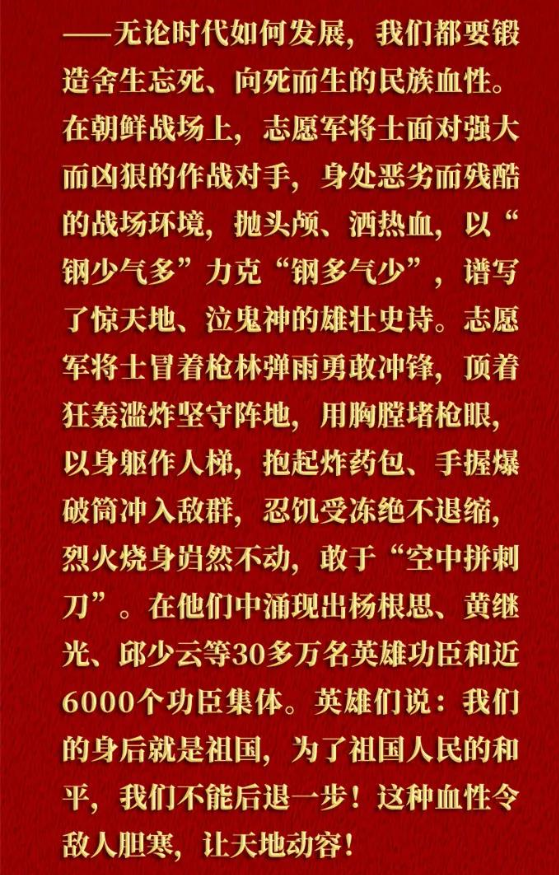 上午10点,纪念中国人民志愿军抗美援朝出国作战70周年大会在北京人民大会堂隆重举行,习近平总书记出席大会并发表重要讲话。在讲到“锻造舍生忘死、向死而生的民族血性”时,习近平总书记说:志愿军将士中涌现出杨根思、黄继光、邱少云等30多万名英雄功臣和近6000个功臣集体。