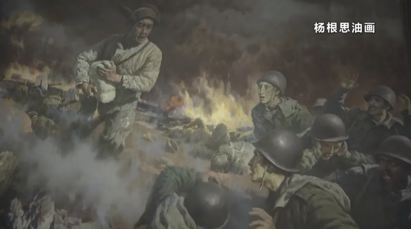 大批敌人已快要涌上山头,杨根思抱着炸药包,踏着美陆战一师的军旗,冲入敌群。一声巨响,敌人粉身变泥土,英雄辉煌化金星! |