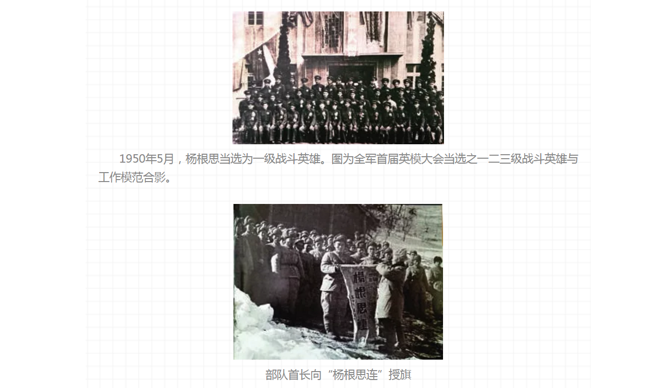 “有我在,阵地就不会丢!” 1950年6月,美帝国主义悍然发动侵朝战争,10月,美国侵略军越过三八线,逼近鸭绿江边,炮轰我国沿江村庄,把战火烧到我国边境。毛主席号召全国人民“抗美援朝,保家卫国”。10月25日,中国人民志愿军雄赳赳、气昂昂,跨过鸭绿江,同朝鲜人民并肩作战,共同打击美国侵略者。11月7日,杨根思随部队入朝。沿途上,杨根思看到美国侵略者在朝鲜犯下的滔天罪行,恨不得一仗把美国强盗全部消灭光。 首批入朝志愿军与朝鲜人民军并肩作战,把敌人赶到清川江以南,赢得了第一次战役的辉煌胜利。美国侵略军头子麦克阿瑟重新集结20万兵力,分东西两线,气势汹汹地向鸭绿江扑来,妄图挽回败局,叫嚷:“圣诞节前结束朝鲜战争。” 为粉碎敌人的狂妄野心,中朝人民军队于11月25日起发起第二次战役,从东西两线同时向敌人发起进攻。杨根思所在部队奉命开往东线长津湖地区,对敌人实施分割围歼。部队冒严寒,顶风雪,翻冰山,越雪岭,一夜行军 100 多里,直插下碣隅里。 分割围歼战打响了。兄弟部队一连拿下了好几个山头。杨根思他们作为第二梯队,还待在下碣隅里东边的山沟里待命。根据全连战士的要求,杨根思几次前往营部请战,要求把最艰巨的任务交给三连。 营长摊开地图,指着1071高地(又名飞鹤山)东南屏障小高岭说:“你们的任务是守住小高岭,切断敌人退路,保证围歼美陆战一师。”杨根思坚定地说:“坚决完成任务!保证人在阵地在,决不让敌人爬上小高岭半步!”