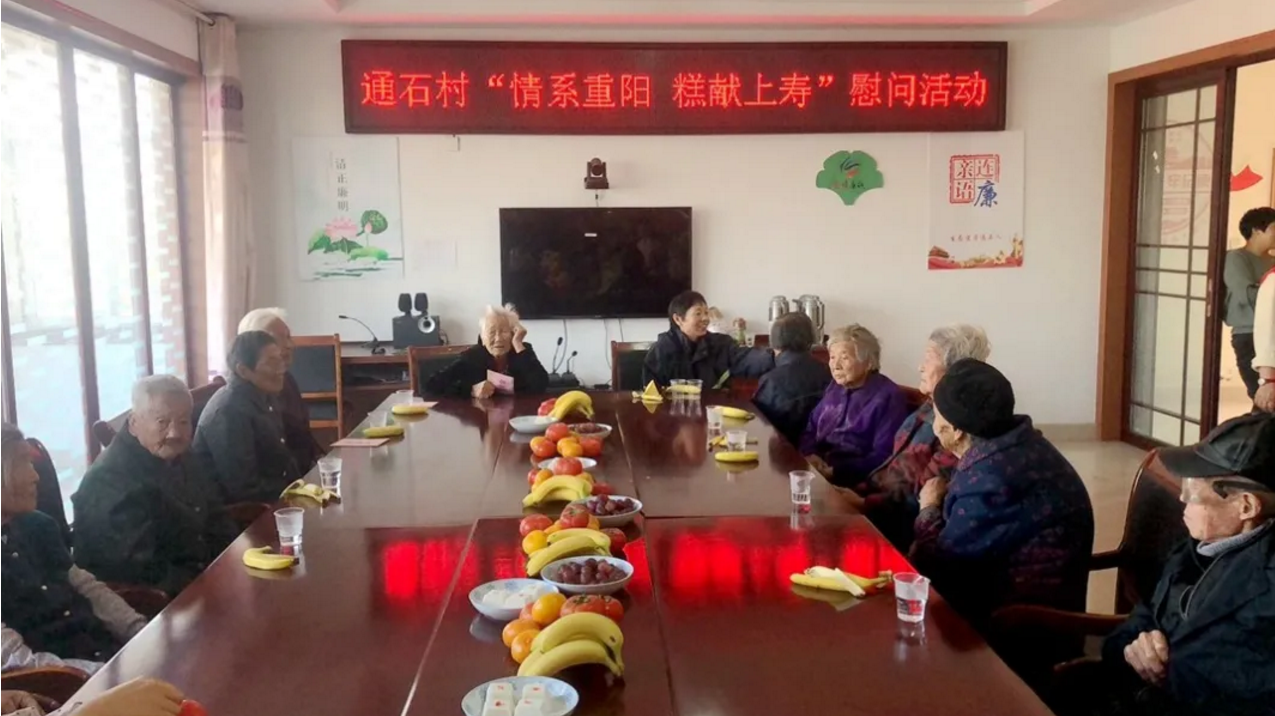 通石村志愿者组织部分少数民族同胞与本村90岁以上的老人欢聚一堂,为老人们送上慰问金和慰问品,并制作“重阳糕”,把浓浓的祝福送给每个老人。