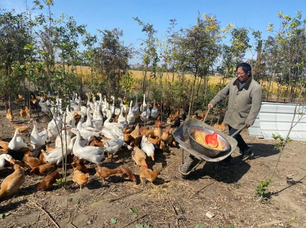 在位于根思乡双联村的华欣源家庭农场内,低保户叶石贯搅拌好饲料,饲喂鸡、鹅。叶石贯介绍,他的家庭是“一户多残”,母亲双目失明,妻子智力障碍,自己因为患有脑积水时常会晕倒,家中还有一个上小学的孩子需要照料,无法外出打工,只能在村里找点零工做。在乡村两级的帮助下,他家被定为低保户,村里提供打扫路面等公益岗位,再加上在农场打零工,一年可以有三万元的收入。