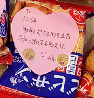 2020年10月26日上午,为感谢医护人员的救命之恩,患者殷某女儿别出心裁的给内分泌科每位医护人员送来贴有不同感谢语的饼干。