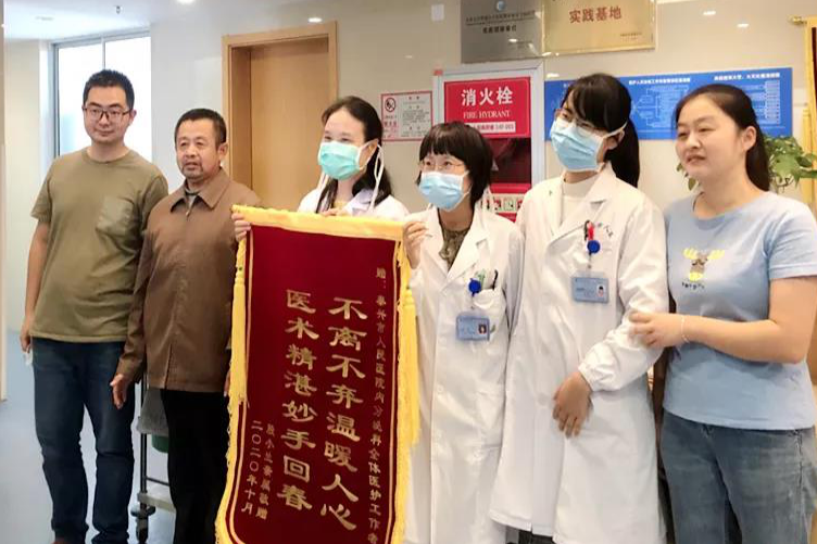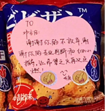 为感谢医护人员给了殷某第二次生命,10月26日一大早,患者家属就举着锦旗赶到医生办公室,激动的连声说“谢谢,谢谢”;患者的女儿更是用心,分别在一袋袋小小的饼干包装上贴上小小的爱心标签,分别写上每一位医护人员的名字和温暖的话语,表达着不同的谢意。 |