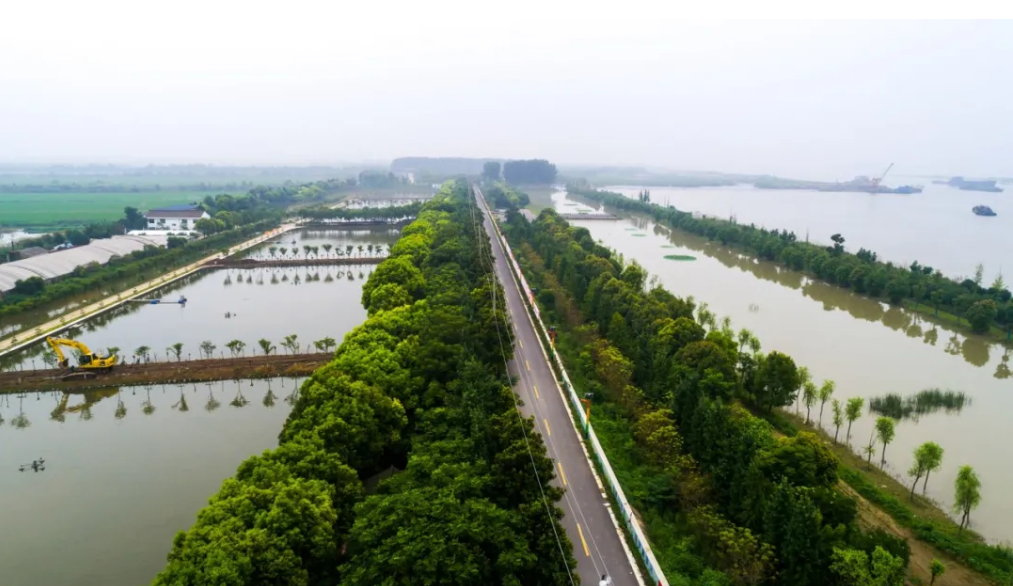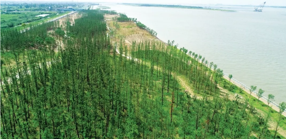 泰兴市长江生态湿地和绿色廊道工程按照绿地、湿地、林地共建,生态效益、经济效益、景观效益结合的要求,采取了堤外理坡、理水,退渔还湿,“高滩建设林带,低滩栽植水生植物”的模式恢复江滩湿地风貌。堤顶按照百年一遇防洪要求拓宽改造。堤内50米植树造林,形成生态林带,并适当增加了适合百姓休闲的小型游园。廊道工程总计恢复湿地3000亩、造林1200亩。2019年10月,泰兴国际半程马拉松比赛就在绿树环绕的江堤上成功举行,让曾经“近水不亲水”的长江江堤变成了市民可以“近水亲水”的生态赛道。