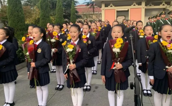 在深情的《献花曲》中,16名礼兵护送8个大型花篮,缓步走向杨根思烈士巨型塑像,将花篮整齐地摆放在塑像前。
