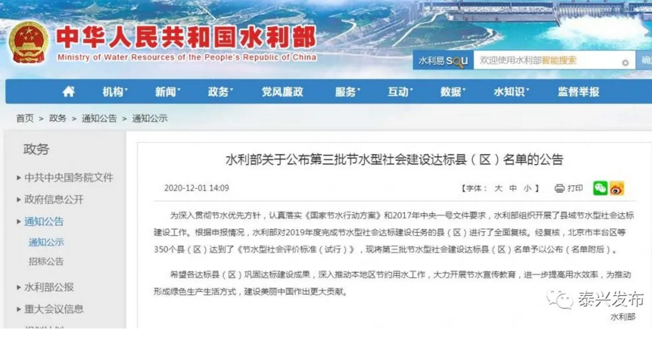 近日,水利部发布关于公布第三批节水型社会建设达标县(区)名单的公告,江苏共14个县(区)达到《节水型社会评价标准(试行)》,泰兴市入选。