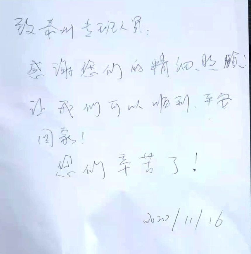 “你去现场一定要把防护服穿好,脱的时候先消毒,按照规定一步一步来。”“开车时一定要注意行车安全,千万别疲劳驾驶。还有,路上您也要把口罩和防护服穿戴好。到了目的地,车辆消杀一定要仔细,时间也得足够30分钟!”“遇到有乘客体温异常,一定要做好其他转运人员的安抚工作。” 工作中,因为要求高、规矩多、纪律严,丁卫锋成为团队中的“纪律主管”。11月,虽然进入初冬时节,但每天6个小时穿着防护服,运送一次旅客下来,丁卫锋和同伴们经常大汗淋漓,衣服会被汗水浸透,双手也被汗水泡得发白、发胀,直至11月29日专班执勤结束。14天,行程8000公里,转运64人平安回到泰州,团队里的所有人没有人喊一句辛苦。= 一天,丁卫锋接到从国外回泰州的一位孕妇,随行的还有她的女儿,行李也特别多。从转运点接到母女俩后,丁卫锋帮助安顿好了行李。在返回泰州的路上,帮助解决其他出行难题,并且叮嘱到达泰州隔离点后的注意事项。被丁卫锋他们的温暖服务感动,下车后,旅客给留下纸条:“感谢你们的精细照顾,让我们能够顺利、平安回家。”丁卫锋将这张纸条拍照放在手机里。“我们的服务得到旅客的认可,并且能够在抗疫前线守护人民的健康,让大家安心工作生活,这样的辛苦很值得!”丁卫锋表示。