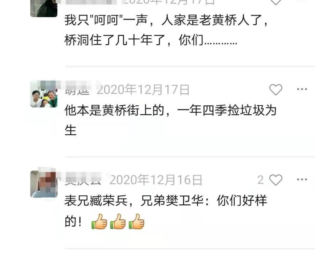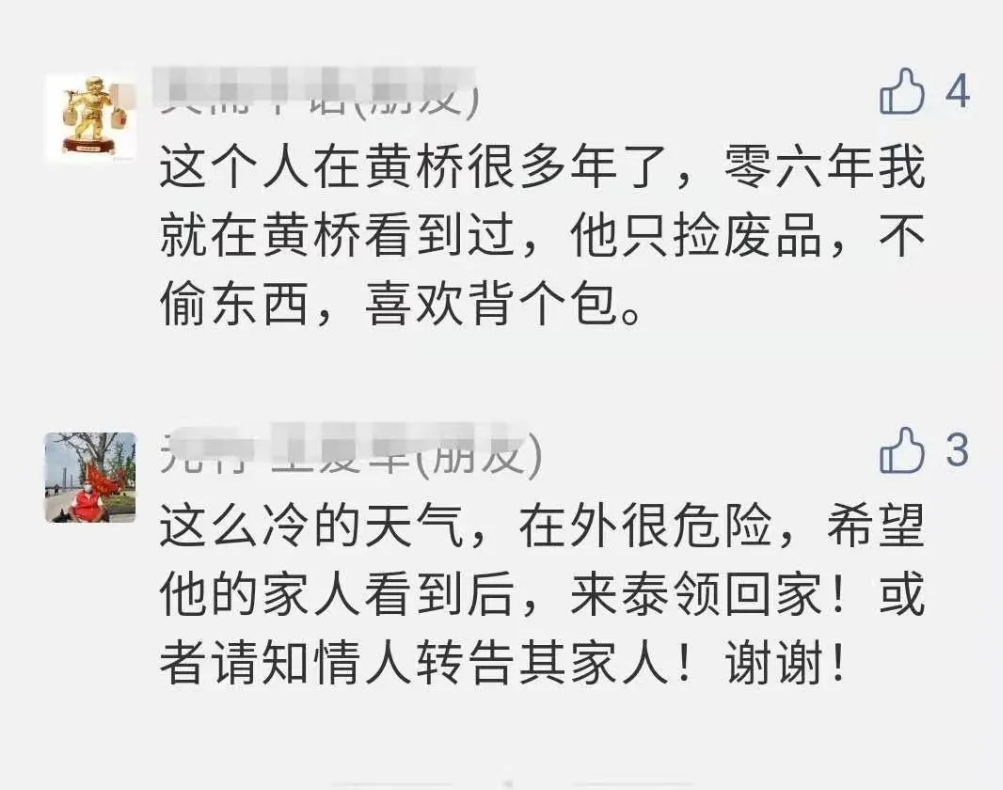 为此,12月16日,老乐在线发布了“老乐在线寻亲513号”寻亲信息:《“桥洞老人”家在何方?》。同时,老乐在线还在抖音、视频号上同步发布了寻人信息。 很多网友看后留言:这个人在黄桥很多年了,甚至有的人认为他就是黄桥本地人。 可能网友从小就看到“桥洞老人”的存在,所以以为他就是黄桥本地人。